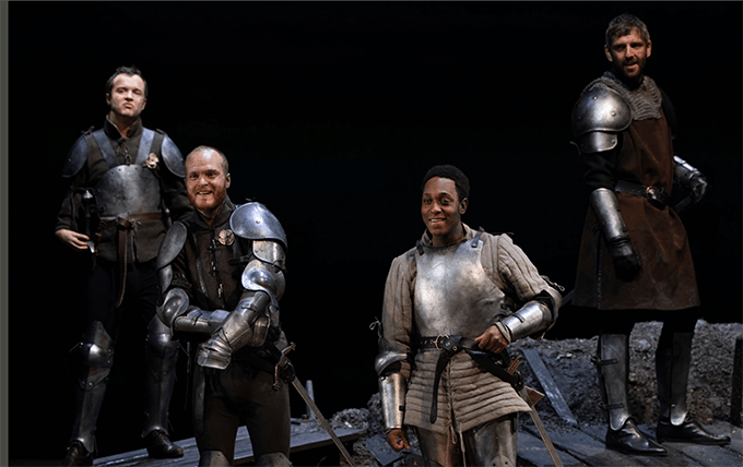 It starts with a bang- Cade and the rebels swoop out across the stage and disappear. Not in the text and a leftover from the preceding play, but it sets the mood. The hand-held black and white filming and projection is more effective in this second play, and the high-speed use of the diagonal walkways onto the thrust stage are as well done as I’ve ever seen it in the theatre. It’s so fast, that if seated next to the walkway, I’d fear getting an armoured man on top of me. That’s going to be lost on tour in most stagings.