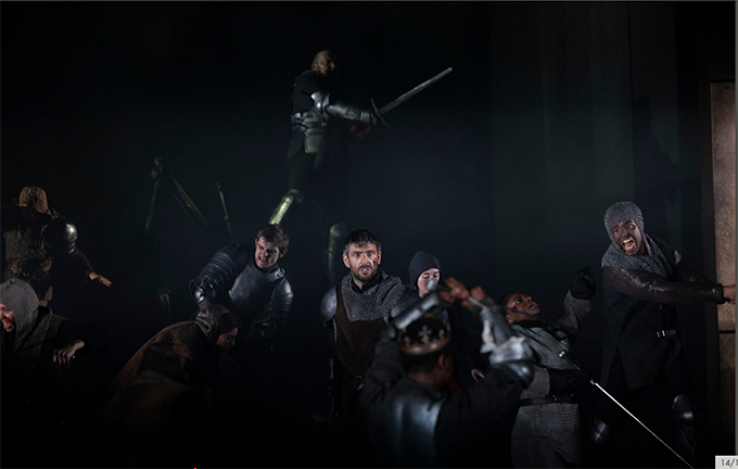 It starts with a bang- Cade and the rebels swoop out across the stage and disappear. Not in the text and a leftover from the preceding play, but it sets the mood. The hand-held black and white filming and projection is more effective in this second play, and the high-speed use of the diagonal walkways onto the thrust stage are as well done as I’ve ever seen it in the theatre. It’s so fast, that if seated next to the walkway, I’d fear getting an armoured man on top of me. That’s going to be lost on tour in most stagings.