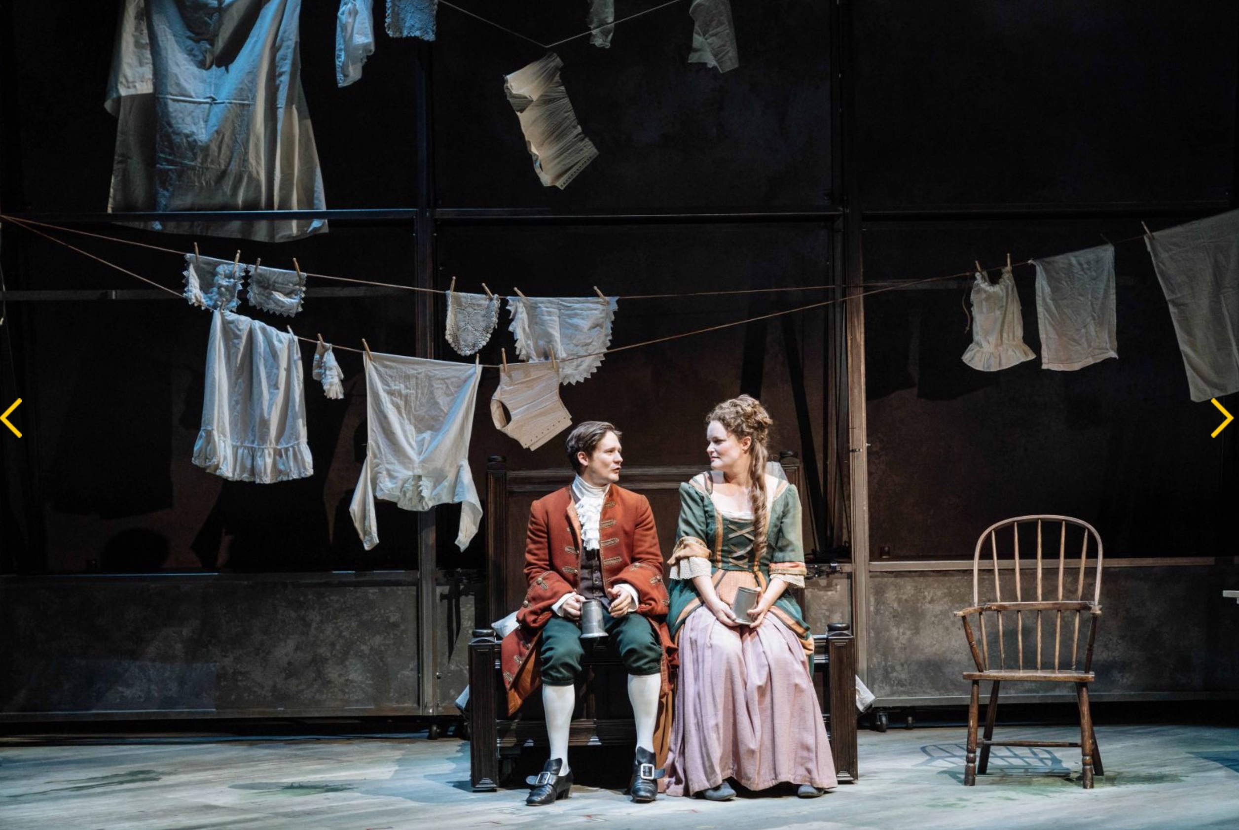 Then there’s the Nancy prostitute scene, another two way dialogue, with a third person intervening (the soldier). This is written to the location (see above). As in the earlier play, Hogarth loses clothes, but not as many. Such is our strong association with having seen her in the Poldark TV series, and as with her earlier Jane Hogarth, it’s a surprise to see Ruby Bentall doing such a raunchy sexy scene. Very funny too. We have seen every Poldark episode. I guess Verity did run off with the sea captain. Hogarth encounters her as a prostitute on the towpath. It’s a screamingly funny scene, but look at their interchange: