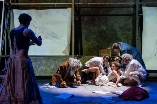 The play opens with a bang, Bryan Dick leaping from the pit to be dressed as Hogarth while a dance movement scene erupts around him. The theatre is built with three stage levels, so two high balconies, so that’s a given and it’s used, but decoratively with characters appearing to watch below, rather than integrated. They utilise a large screen with projections, which can be revolved to show various bedrooms (by hand, but effectively the same as having an NT style revolve stage).