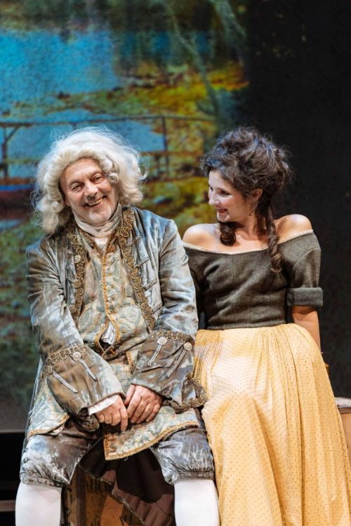 The play falls into a series of scenes … all funny. David Garrick (Mark Umbers) is dressed as in the Hogarth portrait shown in the programme. He gets a run of up-himself theatrical in-jokes that had this audience roaring (but this audience had many recognizable actors as well as critics). We get a lot on Garrick’s re-versioning of Shakespeare.