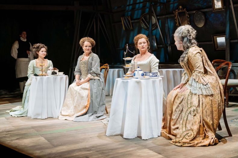 Then there’s the London tea shop scene, where Jane Hogarth and Lady Thornhill meet two intellectual ladies, Mrs Colquhoun (Emma Cunnife) and Mrs Wyall (Ruby Bentall). Great comedy again. The two women are referred to as “blue stockings.” I thought that was a Victorian term, but I looked it up. Trust the playwright. The Blue Stocking Society was a literary society in the 1750s, founded by Elizabeth Montague.