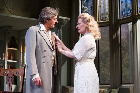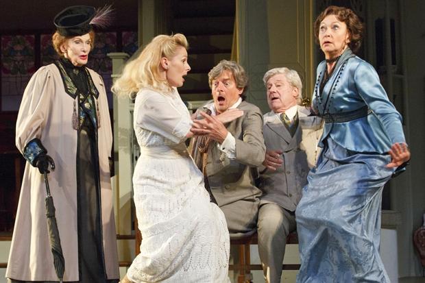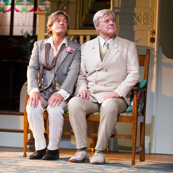 The production has a gorgeous Arts & Craft era living room set with French window to a garden stage left. It’s not the set of The Importance of Being Earnest as played in a Nantwich theatre though, but the living room of George and Lavinia Spelman, who preserve an 1890s arts style in the house (albeit with a TV set concealed in a beautiful cabinet). They run the Bunbury Players and the “actual play” which we are to see is the dress rehearsal in their house. George Spelman (Patrick Godfrey) plays the two butlers, Merriman and Lane, in his first performance for The Bunbury Players following the death of their founder, Charlie. Lavinia (Sean Philips) has always played Lady Bracknell. Tony (Martin Jarvis) has always directed the play and plays Jack Worthing, while the rakish Dick (Nigel Havers) has always played Algernon. So everyone in the cast has two roles, first the Am Dram member of the Bunbury Company of players, and second the role which that person plays in the Importance.