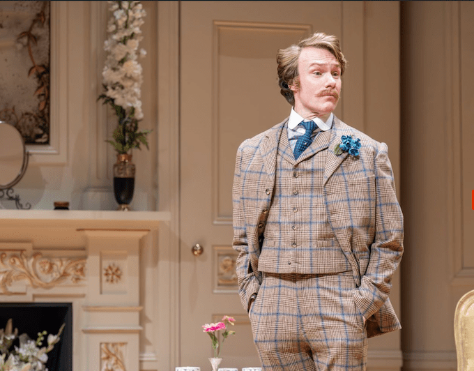 Hugh Skinner plays Jack Worthing, sporting Oscar Wilde’s green carnation buttonhole. Micheál Mac Liammóir wore one when he presented his The Importance of Being Oscar when I was at Hull though he added lipstick and eye shadow. He did a separate chat for the drama department and friends had to take him to lunch in central Hull. It wasn’t a local fashion.