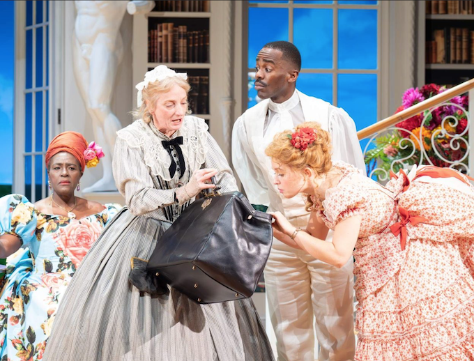 Lady Bracknell is played by Sharon D. Clarke. You need to get out from under Dame Edith Evans mighty shadow in this role. Some disappoint … we watched Penelope Keith reproduce the Edith Evans. I’ve seen it done beautifully by Rain & Shine, playing Lady Bracknell as about forty and sexy (which fits the text). Then in 2015, David Suchet did Lady Bracknell, which also gave the role a twist. This might be the biggest yet. Sharon D. Clarke plays it as a snooty Afro-Caribbean matriarch, complete with Caribbean accent.