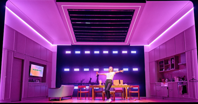 Well, not actually ‘live’ in that Poole had three streamings this month. They had to keep adding more. This is the same writer, Suzie Miller, and director, Justin Martin, as Prima Facie which we haven’t seen yet. Tickets for both were near impossible to get and even the first two local streamings sold out right away. Tonight was full. Next year’s Prima Facie tour was totally sold out weeks ago. We started with Bath, then Cardiff, then Canterbury, then Birmingham for tickets. No joy. On these two playa, Suzie Miller is a phenomenon. She is a lawyer turned playwright. Prima Facie was a one hander. Inter Alia is more complex while still revolving around one central actor, Rosamund Pike, who never leaves the stage, and everything is channeled through her.