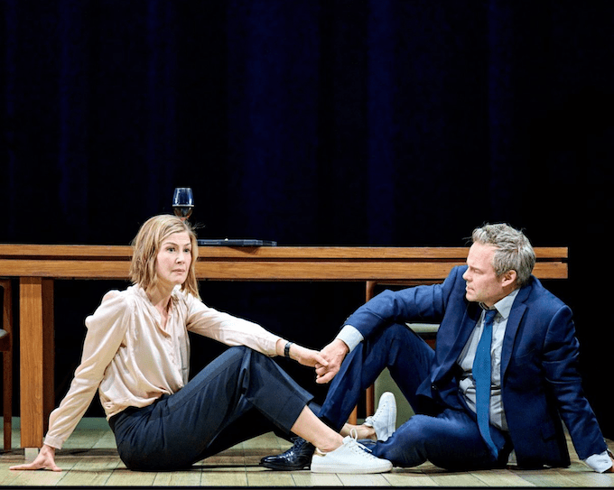 She had fifteen years away from live theatre. How did she adjust to this amount of non-stop energy? Film is about four minutes shot in a day. For actors so much is waiting to perform. Not here. Pike does nearly all the speaking. She holds conversations with fellow judges and lawyers, Grace and Danielle, and with Marshall, a KC (Kings Counsel = Barrister). She does both her voice and the response from the person she is talking too. She does mild Irish for Grace, mild Northern for Danielle, RP for Marshall. Marshall is represented by a jacket on a chair. I was in awe of her technique. We used to do this in ELT Teacher training, how to present a dialogue in class when you have no recorded material on audio. You try to represent two speakers with voice and movement. The way she did a conversation shifting the phone from one ear (her) to the other ear (Grace) was brilliant. We tried to teach that, but she could have taught it much better.