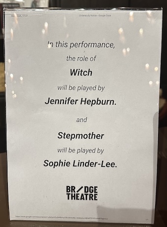 The Witch had been praised for Kate Fleetwood’s performance. We’ve seen her before and wanted to see her again. We had an understudy tonight. Jennifer Hepburn was so good you would never have known, but forgive my cynicism for saying, ‘Monday. Let the star have a second day off and give the understudies a run.’ With this quality of understudies, I’m sure we lost nothing.