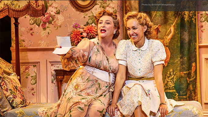 I’m not doing jokes or plot spoilers. Bean and Chris have clearly thought back to James Corden’s success as the servant breaking the fourth wall and addressing the audience in One Man Two Guv’nors. They have learned not to place all their eggs in one basket, or all their best lines on one actor. Oliver Chris was there in that play alongside Corden. Just about everyone is allowed to address the audience here, though the longer direct to audience pieces are given to Mrs Malaprop (Caroline Quentin) who opens the play, and to Kerry Howard as Lucy.