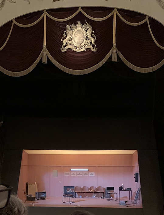 The trapezium shape means that when a road is projected at the bottom it has the sense of perspective. After the Tempest the night before it confirms that continual projection rather than odd interludes is the standard thing now. The video projection designer takes their place next to the set, costume, light and sound designers in the list of creatives. I did not envy the sound operator … there are just so many phone ringing sounds to place, and all have to be perfectly timed live.