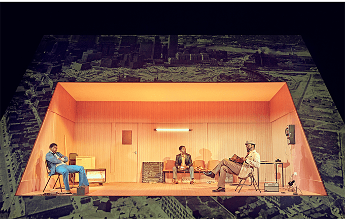First the set. It’s a trapezium box set within a wide sloping backward frame, which outer frame is used for projection throughout, sometimes stills of Pittsburgh or sections of maps, then towards the end, it’s a moving projection of Pittsburgh landmarks.