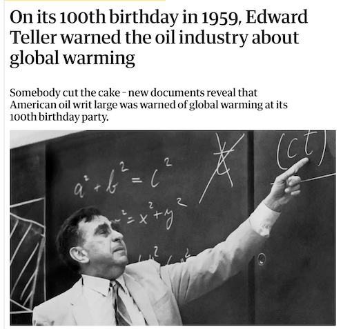 The important information comes in Act Two. The oil companies understood back in 1959 that fossil fuels were definitely causing global warming and they sat on the studies. They did their own research, which confirmed it by 1979. They still sat on it.
