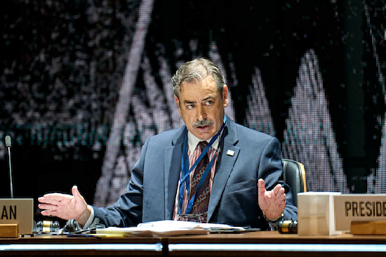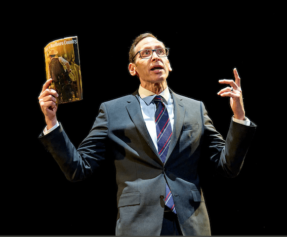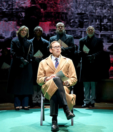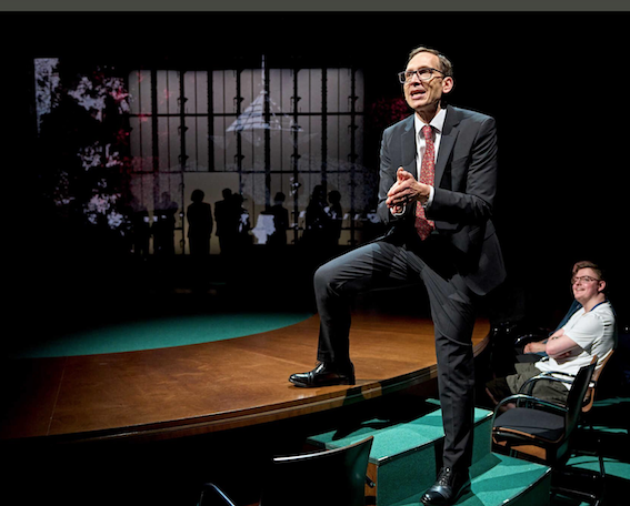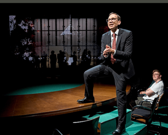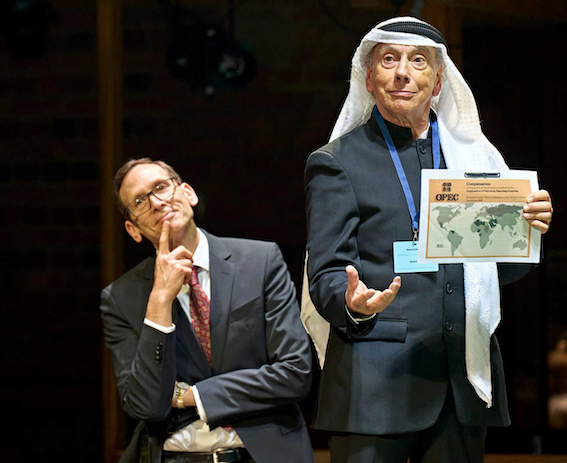 The problem in Act One is we never get as far as Kyoto. We run through one ineffective climate conference after another with everyone racing round and going on and off. Not more! We groan. Delegates are constantly shifting places. We don’t work out until Act two that when everyone is wearing a dark grey coat and scarf, they are the ‘seven sisters’ or the major oil companies, giving their instructions to Pearlman. Stephen Kunken as Pearlman, narrates and holds everything together. He is the creature of both the US government and Big Oil, which might be the same entity. It is the central role of the play: