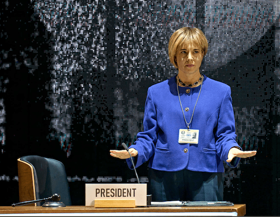 The dastardly alliance is the USA and Saudi Arabia. Pearlman is pushed away from the centre as the obvious Big Oil representative but the official delegation from the USA remains the reluctant player. Nancy Crane’s USA (with no name) looks perfect – I think Hilary Clinton. The role combines being a serious and convincing stateswoman, while saying ‘fuck’ a lot in asides.