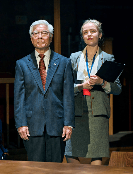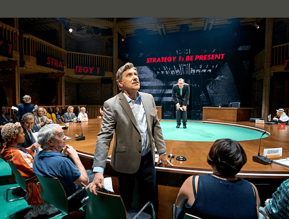 The staging looked great on the RSC photo gallery, but from where we were sitting it was awful. The ‘real’ delegates shifted between the empty seats at various points of the circle. Very often we couldn’t see them. Karen has top grade hearing aids and the multiple directions of speech were beyond their capability. This is highly unusual. She said it sounded confusing throughout, and the accents from several delegates didn’t help. Not all the delegates looked nationals of the countries they represented. Japan was easily the most real. I taught Saudis for years. I never met one who looked or sounded like that, but I never met one of the Western educated ones in extreme positions of power. If you are going, definitely try to switch your tickets to seats upstairs in the gallery. The best seats are the worst. Screw what it looks like, in effect it was dreadful set design for audience members from where we were sitting. Maybe it was OK further back where the rake started.
