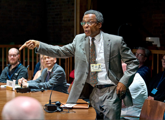 They created a circular delegate conference table on the thrust stage, with the audience on three sides, and then interspersed audience members around the circular table as delegates to fill in between the actors – you had to choose a delegate seat. I wish we had. Our booking got moved when they decided on that plan, we were offered, declined and we were in row C on the flat. No rake, nor behind us, The row In front on ordinary chairs looked an inch at least higher, and we had very burly people in front of us. I qualify as very burly myself and the elderly man behind me moved. Quite rightly. He wouldn’t have seen anything through me.