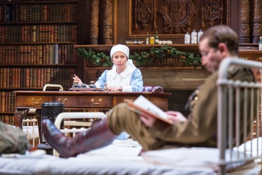 We begin at the RSC with hospital beds lined up in the stately home library, Leonato is in uniform, and Hero, Beatrice, Ursula and Margaret are dressed as nurses. It’s like the convalescent home that Downtown Abbey was temporarily … or many country houses were. The soldiers return from war, and Don John (Sam Alexander) is limping and on a crutch. Borachio is his valet, Conrade is another officer. The crutch helps put Don John in a meaner mood no doubt.
