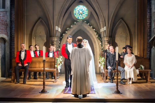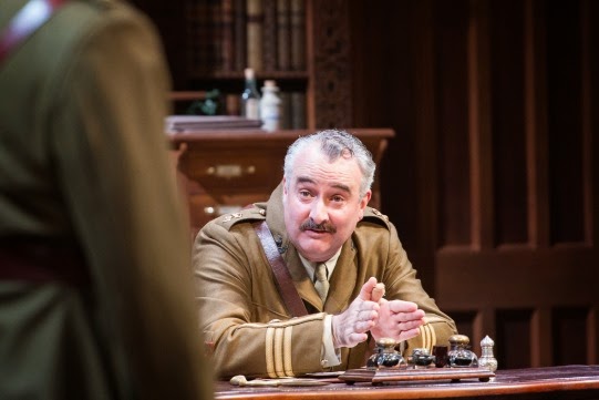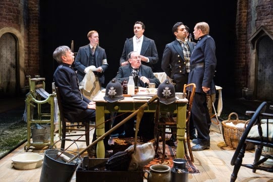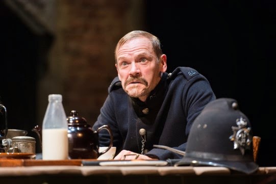 I noticed that in the church scenes the voices echoed as they would in a church. Was this merely an effect of the set, pushed right forward on the thrust stage, or was it (as I think) concealed mics adding an echo process above the natural unamplified voices? Very clever sound if so. It was played totally real, dramatic, sad. Not a hint of overplaying or sending up the high drama (which it has to be said is sometimes done). Benedick and Beatrice both stayed serious. In fact throughout the play, the fact that Leonato (David Horovitch), Antonio (Thomas Wheatley), Claudio (Tunji Kasim) and Don Pedro (John Hodgkinson) were played absolutely straight enhanced the focus of humour on Beatrice and Benedick. The watch is always a separate element played for farce, and rarely intersects with the rest of the action. Because of this, the whole play seemed more “real” and genuinely 1918 than I would have expected from a Shakespeare comedy.