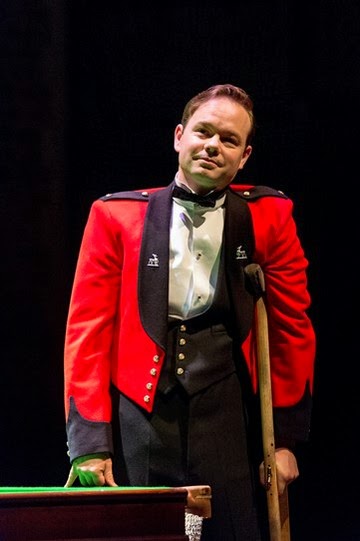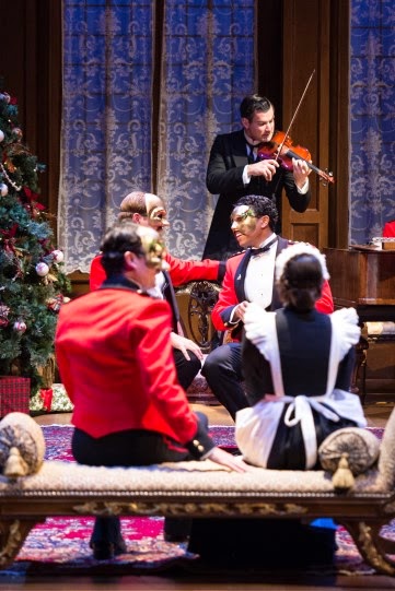 For Don John’s first plotting scene, he and Conrade appear from below playing billiards on a full size table (and Conrade neatly pots the red). We see a drawing room with a magnificent Christmas tree for the masked ball scene, which is wisely done with eye masks as in all sensible productions … you don’t want muffled voices. As in Love’s Labour’s Lost there is a major piano and vocal piece here.