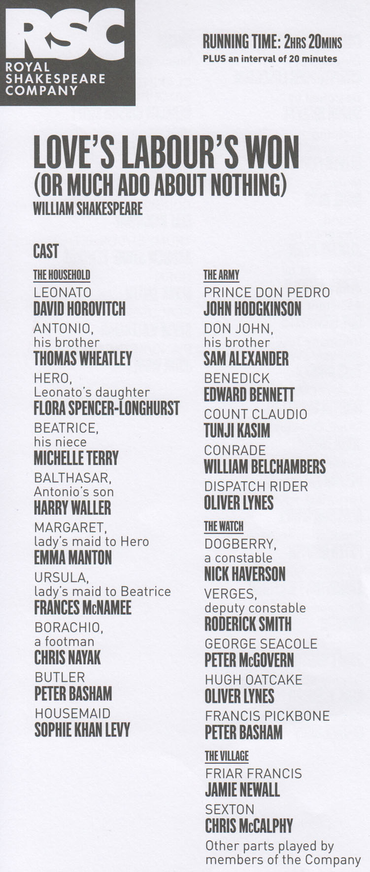 In the last year, I’ve seen the misguided one (The Old Vic) and the excellent cut-down high energy Globe production, as well as the previous Globe on DVD and the films. This RSC production is the complete Much Ado About Nothing, with the full comic to tragic range. The post-World War One theme worked perfectly. Beautifully acted by every single cast member, memorable music score, state of the art realistic set design. Great comedy direction. Five star. In fact, Lost and Won are a pair of five star productions.OTHER PRODUCTIONS