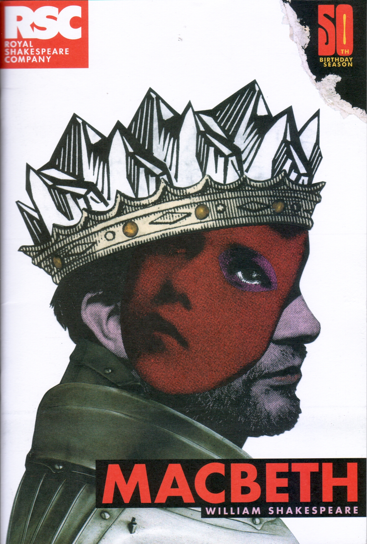 The other part of the big idea is that the ghosts stay on. By the end, the ghosts of Lady MacDuff and her children are present in the background following the action. It’s the most powerful image in the play. The murder of Lady MacDuff and her children is truly horrible. They kill the boys, then a murderer leads the little girl away at knifepoint … ice travels up your spine. You know what happens to female children in war. The wife and children, with the murdered Banquo, become a permanent accusation. They’re the collateral damage in war. This is what makes this production so truly grim, and so truly 2011. Note how the programme illustration (above) superimposes a sad child’s face on Macbeth.