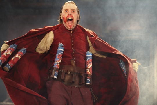 The big, well, only, comedy, scene in Macbeth is the porter scene, utilising comedy to separate the high tragedy of the murder. I truly believe that Shakespeare would use any device he could to get the audience going. But … the porter scene for me didn’t work. The cast list here is strange. Jamie Beamish is listed as ‘Seyton’ (Macbeth’s lieutenant), not as “The porter”, and later the porter escorts people to the underworld (Satan?) So Jamie Beamish, as the porter comes on with an Irish accent and throws open his coat to reveal himself as a suicide bomber with brightly coloured large fireworks strapped round him rather than dynamite. The audience interaction he gets up to with these is well-executed physical comedy. Everyone thinks ‘suicide bomber’ but the long coat, the Irish accent and the huge smile are I think references to James Coburn, as the Irish terrorist and dynamite expert in Sergio Leone’s A Fistful of Dynamite (aka, Duck, you sucker!)