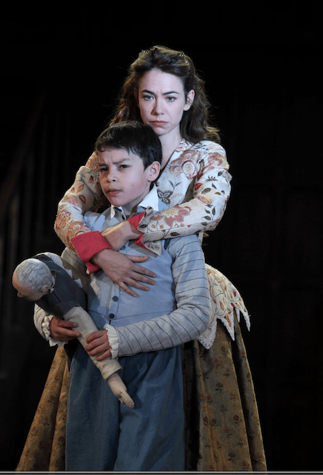 You would expect a big idea. You get it. The big idea in this is that the three weird sisters are three children, two boys and a girl. One of the most dramatic moments I’ve ever seen is their arrival, swinging from the air on meat hooks, as if on gibbets. It’s also just behind the expected scripted point, creating tension. So brilliantly are the child actors performing this that I thought they were puppets until one suddenly jerked to cue. The children get over the normal panto children projection problem by having concealed microphones and speaking with amplified echo. The big idea reveals itself to be bigger than you think. The three children appear again, in the same clothes, but now cleaner, as Lady MacDuff’s children, so that in retrospect, they are a projection back from the future (in sci-fi terms!) when Macbeth first encounters them. Some people had a problem with the logic of it all, but anyone who’s seen Back To The Future or a dozen movies with the same device has no problem with it.