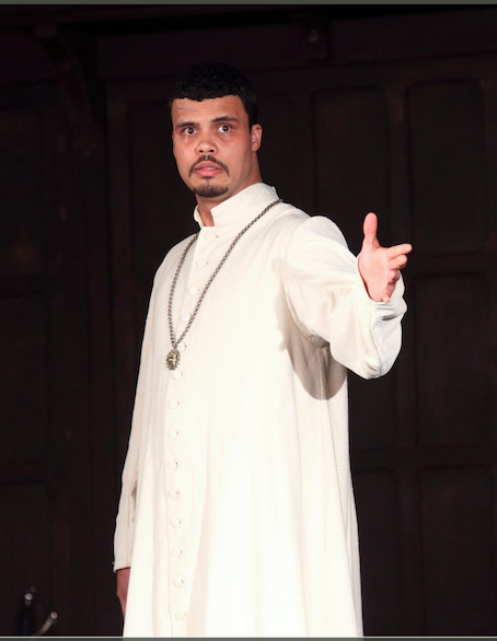 Costume leads to a further point. The ethnicity of actors. We’re used to seeing a variety of ethnicity in Shakespeare. It’s usually colour blind (as it was in Cardenio, and The City Madam in RSCs 2011 season) in the sense that it’s irrelevant, which is what it should be. Some productions are TOO colour blind. I found a black Hamlet with a white Old Hamlet, Claudius and Gertrude disconcerting a few years ago. We are programmed with awareness of genetic inheritance (Ooh! She’s got her grandma’s hands!). If you accept that, then you’re aware that (say) having a black Hamlet, white Old Hamlet and Claudius but a black Polonius would automatically add a new level of speculation and incest that’s not supposed to be there. We’re not THAT colour blind. This production has a black dreadlocked Banquo, and his son, Fleance, is black too. So some thought has gone in. The lady-in-waiting, played By Madeleine Appiah does it with an African accent.