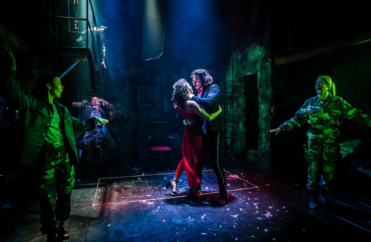 The set by Katie Lias is battered brick as if we’re in a hotel badly hit in a battle. There are two shell holes in the walls, and three doors (open in outdoor scenes). The numbers have fallen off, so what used to be 67, 68, 69 now reads ‘666’. The HOTEL sign later loses the O and T to read HEL.