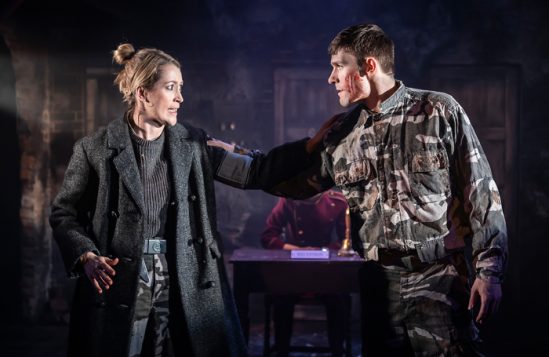 It’s a play where fashionable gender blindness sits particularly badly (as it did three times last year), but having seen the Watermill’s constraints with a small cast, there is more justification than usual. They have a 50 / 50 gender balance in the ensemble and distribute parts accordingly. They’re also compressing nearly 40 roles to 10 actors. They get it right where our great institutions (NT, RSC, Globe) get it wrong. Yes, Banquo becomes female, and then they refer to Banquo as “she” and Fleance is “her daughter.” The porter is female (not a problem). Malcolm is female, and keeps the name but is referred to as “she.” What they don’t do, Globe take note, is have a female Hamlet played as a man, or a male Rosalind played as a woman or (heaven forbid) the announced female playing Falstaff for 2019. The other thing, is they use the cast they have, but do not eliminate sexuality. A lot of the time, the women are in battledress, but then when the role calls, they’re in slinky minidresses … as in the five witches at the start of the second part, or the female chorus on the murder of King Duncan.