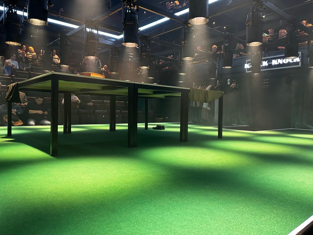 The production is in the round at balcony level, though a tennis court (two sides facing each other) at stalls level where we were. It was virtually fully booked, fully booked most evenings, but but we found the last two separate single seats, both in the front row. There were no two together seats left on sale, though it turned out I had two empty seats next to me. A no show.