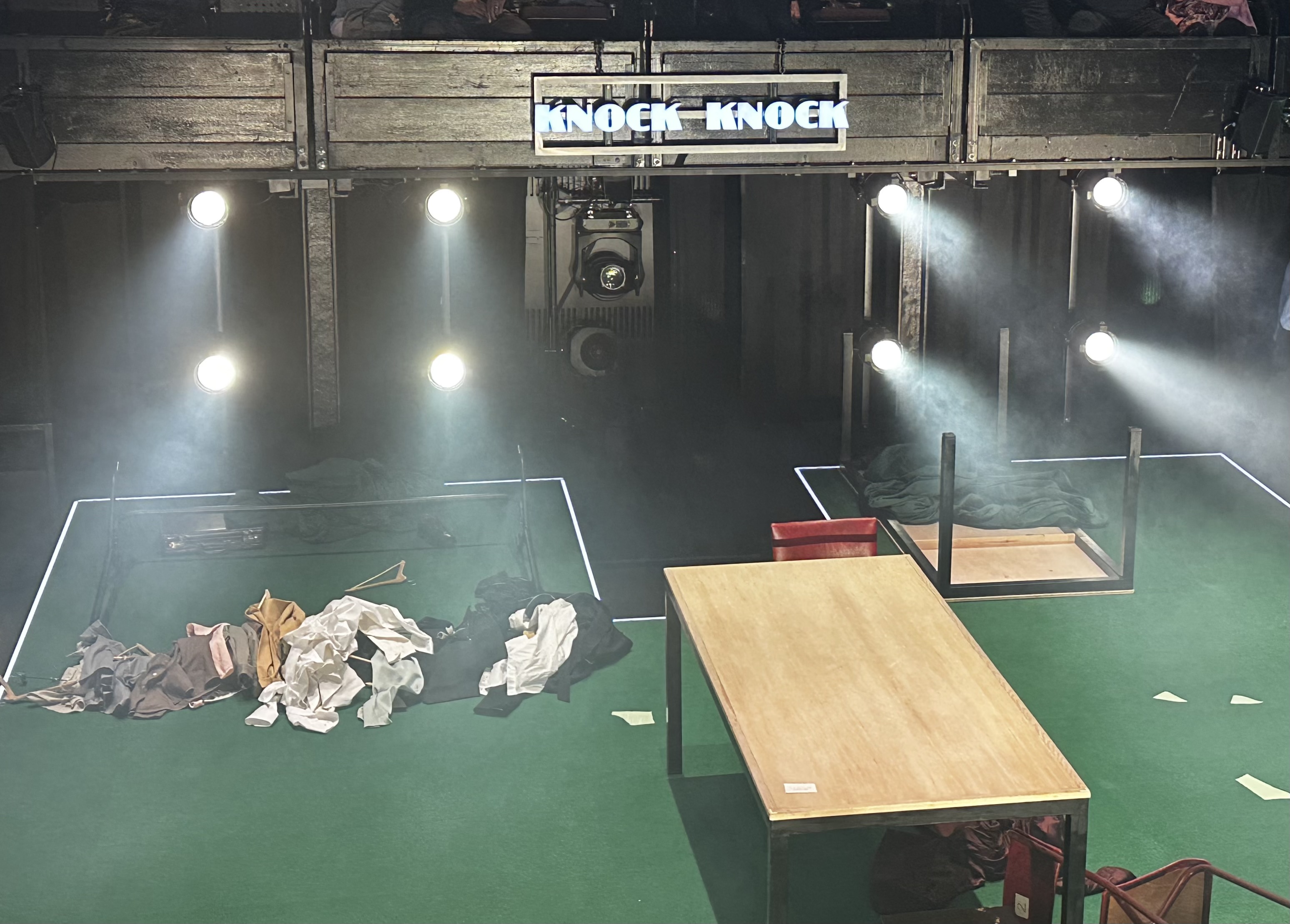 By the interval, the upturned table is now Basil’s bedroom. At the start, the central tables were the bedroom. It’s fluid.