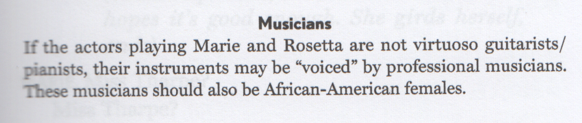 Rosetta is a guitarist and Marie a pianist. The playwright foresaw the issue. You need two first rate actors (got it) who are first rate singers (got it). Asking them to be virtuoso pianist and guitarist as well is a step too far in nearly any production. So they have the guitarist and pianist either side. Rosetta opens a guitar case on the floor to signal the guitar playing, the curtains open at the side, the guitarist plays. I think it works better than (say) miming. The text has a note (BTW, the text is over-priced at £10.99 for 80 pages. Also they could discount to sell in a production).