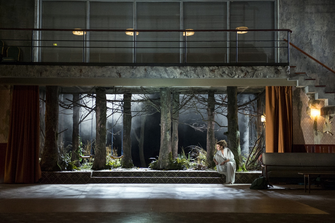 Then at the back, there is a stylized, terrifying forest with a modern, glass-walled building floating above it, which serves as the palace / wedding venue as well as the place for the orchestra and at times the chorus. It works superbly. We only see Kreusa, Jason’s intended bride, up on high … she has a sexy dance with Jason, and then she has to die in agony in her poisoned cloak … all seen above the action.