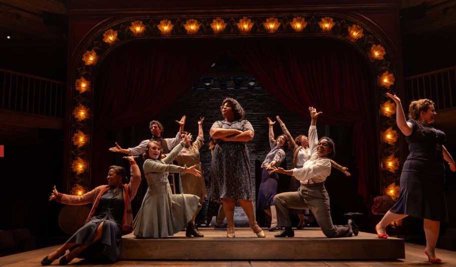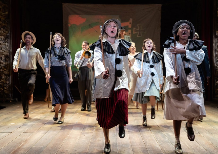 Ten women and three men in the cast. They cover forty-two roles, some of them fleeting. Sam Kenyon says they tried it with eight women and just one man at the initial workshop reading. The play text notes that changes can be done with simply hats, and you only need a basic piano, but here (I’m pleased to say) the changes of costume were elaborate, and carefully tuned to the projected year too. A triumph for backstage costume management, I’d say. I noted little details … phones are brought on stage several times, and each one is different, and right for the year. There was also a full sounding band to accompany, and in the second half some of them moved down to stage level. As in Mrs Rich, Amanda Hadingue added violin, and two of the cast had a go at trombone, one a trumpet. Greg Barnett added guitar as “Jimmie Millar.”