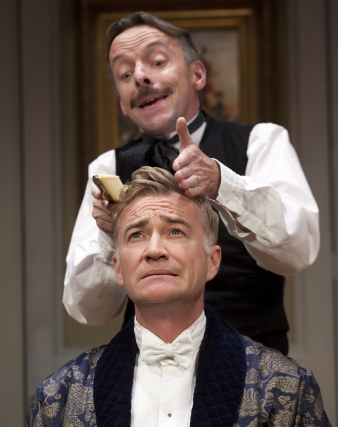 Pitois (Stephen Matthews) checks Celimare (Raymond Coulthard) for grey hairs before the wedding