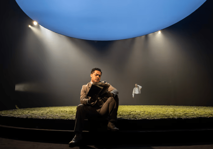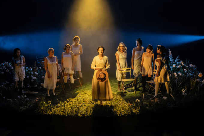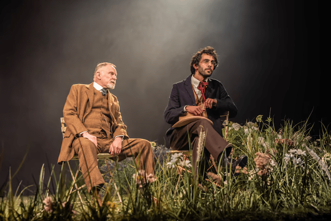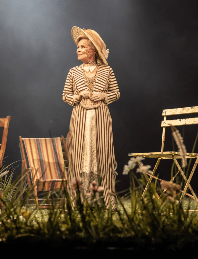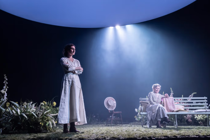 This is very different to the 2022 version. The stage is a circular revolve, with a large round / oval light above. Yet it’s on a proscenium stage. There is no set in Acts 1 to 3, just a bench and chairs with grass and a flower bed. Much needed humour is injected in assembling the garden chairs. Shaw wrote it in four acts, ignoring the fact that Shakespeare is five acts, and most plays of his era were three acts. That’s Shaw. He knew better. After Act 3, the lawn is rolled up. In Act 4, a curved back set drops down from above. It all works smoothly, but it leaves the lit stage surrounded by dusty black, and the cottage where they have dinner and the church are imagined off stage in the murky gloom.