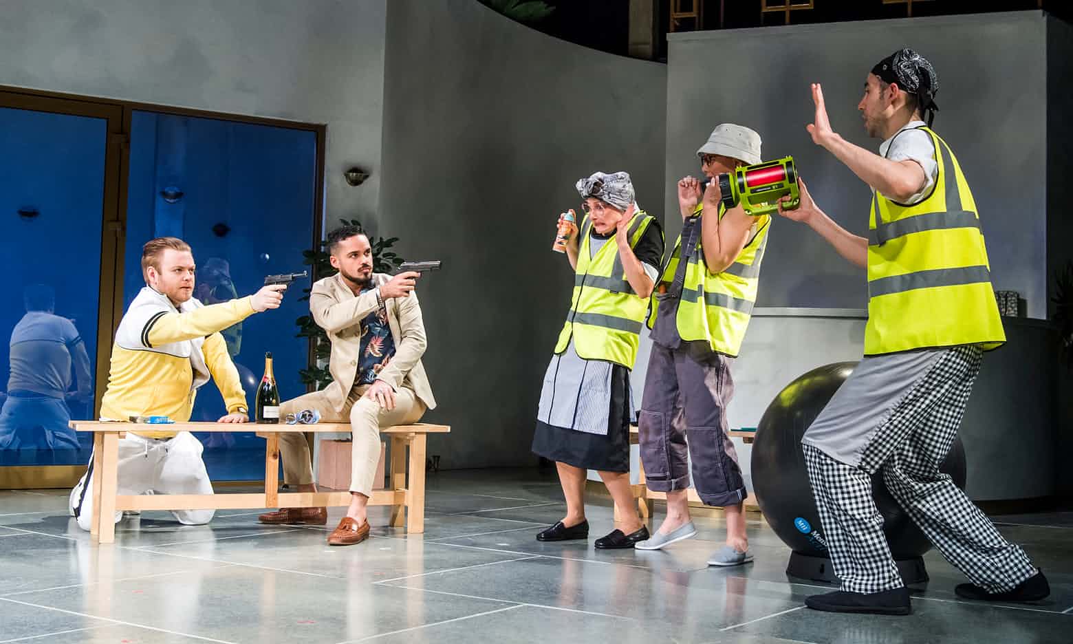 The first rate programme notes by Richard Wilson point out that the opening line Don Pedro of Aragon comes this night … would have alarmed Protestant audiences just ten years after the Spanish Armada … Aragon was the Spanish royal house, plus the villainous brother Don John was the name of the illegitimate brother of the King of Spain, just as Don John is the bastard here. Sicily, the setting for the play, and Naples, were part of the Spanish Mediterranean Empire. It’s also pointed out that at the time of the Armada threat, there were local watches along the coast, very much the originals of Dad’s Army: old men and beardless youths. So Dogberry and the Watch, so often portrayed nowadays as a Dads Army group, are actually the originals. Here they become security guards in hi-res waistcoats.