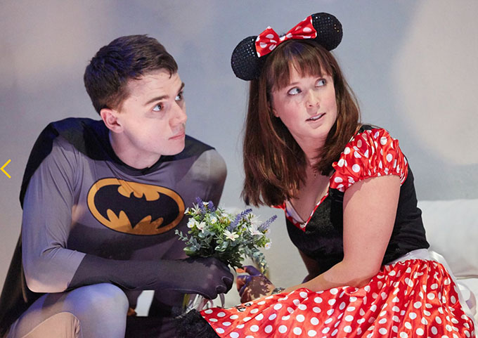 The masked ball is, as in Romeo & Juliet, an early important plot point. You can either do it minimalist, assuming the eye and nose masks were an accepted fiction … an obviously false attempt at disguise … back then. Or you can say, ‘No, they really were completely masked.’ As so often in masked balls, they went for the full Fancy Dress Shop 2018 costumes with funny animals and superhero suits, with Hero (Kate Lamb) facially visible in her Minnie Mouse dress, and with Claudio as Batman. The balcony helped here, because they added a bit with Leonato and Antonio getting dressed up. Leonato as a lion … only in typing this did the penny drop … Leo … lion. So even though fully disguised we knew who they were. Just as in The Globe’s Romeo & Juliet in 2017, they went way over the top. Beatrice was in a huge cow suit. Too much so, I thought. It detracted from Don John (Peter Bray) who you want to look sinister, not in a slightly silly green and purple muscle suit. There was also blue smoke and live music, and I feel the intercut dialogues lost coherence here. The masked ball looked fine, but ended up staccato and incoherent. It’s supposed to lead to suggestions of seduction and villainy which you can’t pull off when you’re looking daft.
