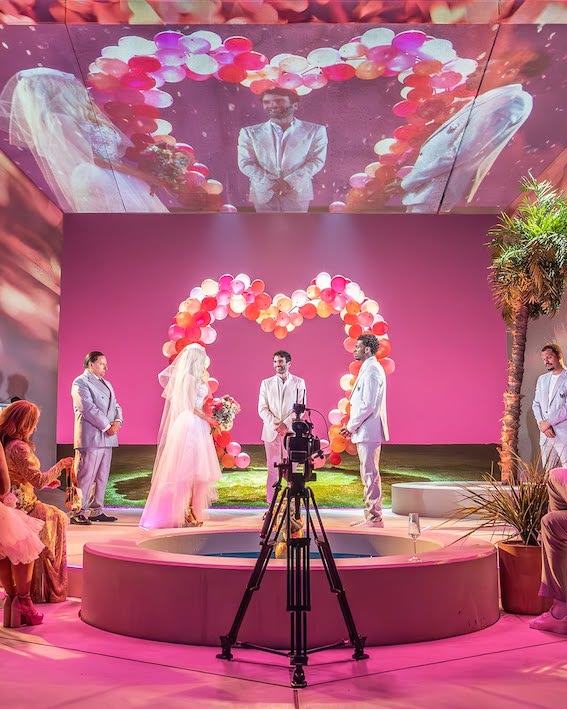 A major feature is technology. The actors can film each other at will with iPhones and they are projected on the long narrow side screens and on the central top screen above the stage. When onstage filming became popular a few years ago it was small video cameras. I think just using a plain iPhone is a first. Similarly as we move into the ‘tragedy’ of the wedding rejection, we get multiple tweets projected all over the theatre. You can only read a few, but they were along the lines of OMFG! And Tart! And Fuck no! And “Team’s done now’. And ‘my heart bleeds for her.’ There were several inarticulate and half-finished ones. They were very much like Private Eye spoof online discussions and I wish I could have noted more, but there are dozens of them and they change. I bet it was fun composing them.