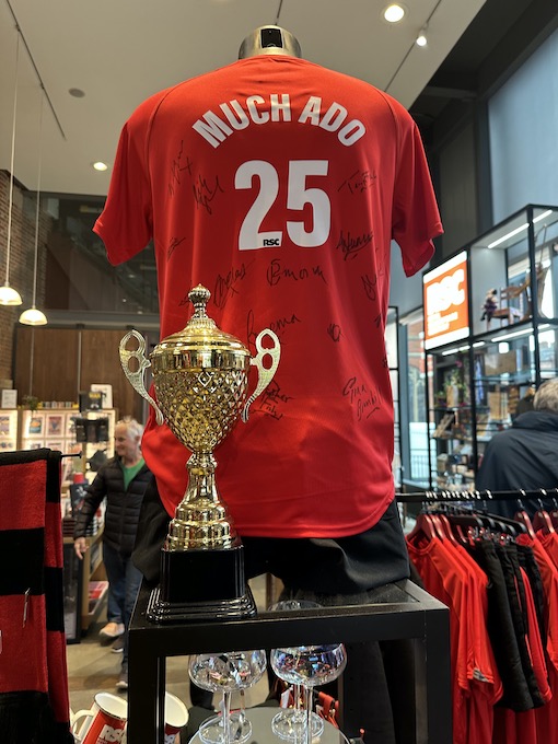 The RSC shop has Much Ado 25 football shirts and shorts with a signed display shirt. Great idea, but why is it red with black shorts and an RSC badge? Messina play in blue with blue shorts. I can see someone wanting a replica Messina shirt with 8 Benedick or 7 Claudio as a souvenir, but a red shirt and red scarf and red beanie doesn’t do it, even if the RSC logo is red.