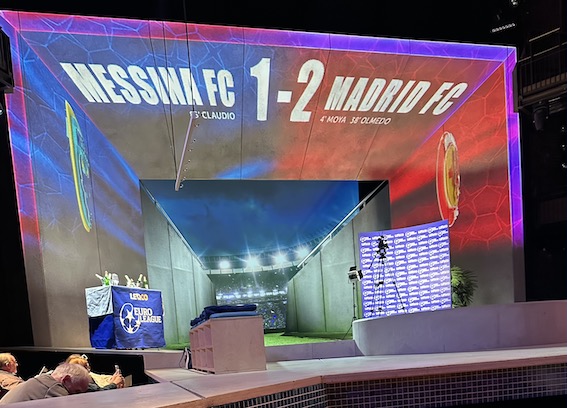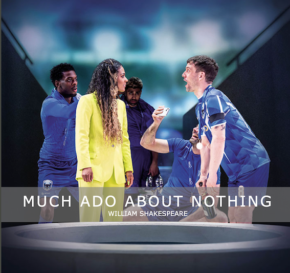 I always find the masked ball scene hard to carry off, but here they do it differently. Only the footballers have masks, a black bull’s head. They wear the official team travelling suits, light grey, bull badge, blue tie. There is one gold bull, presumably for Man of The Match, and Claudio switches it to Don Pedro, who is pretending to be him and setting up the marriage to Hero. The women don’t have masks, but look at the text. They don’t need them.