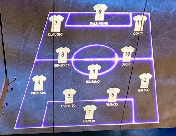 We see the team line up projected. Benedick is in midfield and captain and number 8. Claudio is number 7, and a striker. Don John is number 13, and was a substitute. When we meet him his foot is in a cast. No wonder he’s pissed off. The side screens run through the team members.