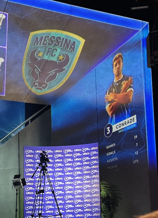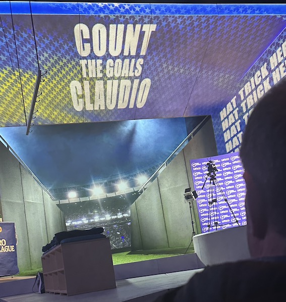 There are side screens. Projection on a top screen and side screen is used frequently. Leonato (Peter Forbes) is now the club owner, and the team are sponsored by Leocom. With his slick black hair and shiny suit, he looks Sicilian, in the New Jersey sense of the word. Would he pass the football league’s requirements for fit and proper owner? Yeah, of course. Just look at others who have.