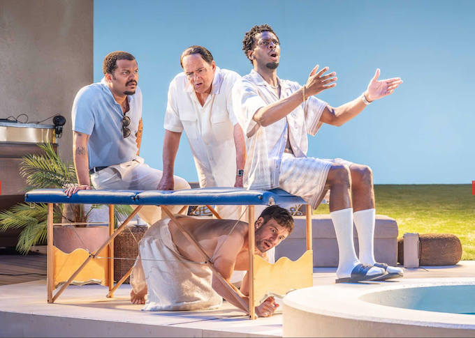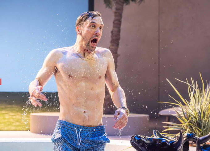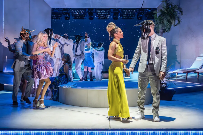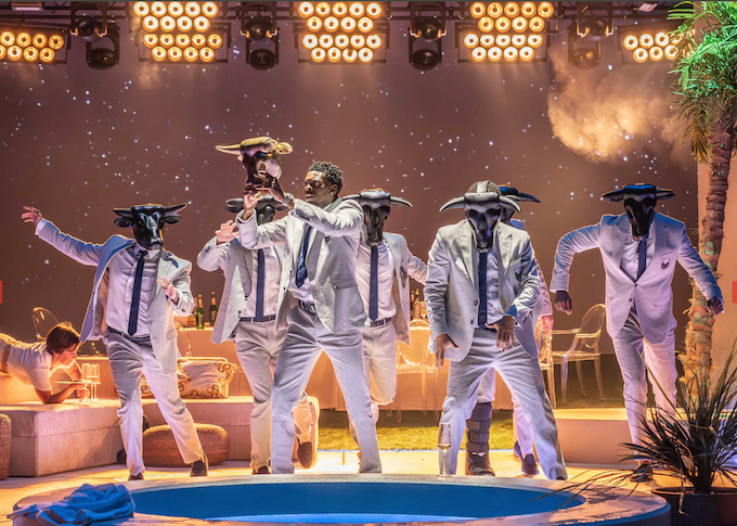 I know why the reviews stay middling Championship, and I reckon the production is better than that. Definitely Premier League for me. All of us saw the Jamie Lloyd production with Tom Hiddleston just weeks ago, set in Ibiza dance clubs, so also high concept, contemporary vivid setting. They dropped Dogberry and the Watch which several reviewers agreed with. They are restored here. The thing is there is about an hour’s difference in running time. This is nearly an hour longer. I have done an ELT adapted version of the play. I have edited another ELT version. I have worked on cutting. In spite of the text changes and the high concept, this is actually a remarkably faithful version of the plot. They do scenes and speeches which others, including me, cut. So it’s very different and just a few weeks after that short sharp all singing and dancing version, it feels long. I don’t think it would in any other year. Reviews note the change of pace and mood in the second half, but that really is intrinsic to the play. It’s an inevitable issue. Blame Shakespeare. The moods are hard to tie together, though I can see why not having the watch and getting through it fast, as Jamie Lloyd did, helps. Three stars is far too miserly. I would say an easy five (Premier League place in Europe) for most of the first half, but perhaps slipping to a four overall, but that will not be the first time that’s been my judgement on the play.