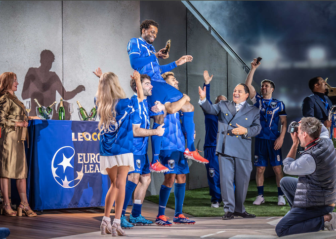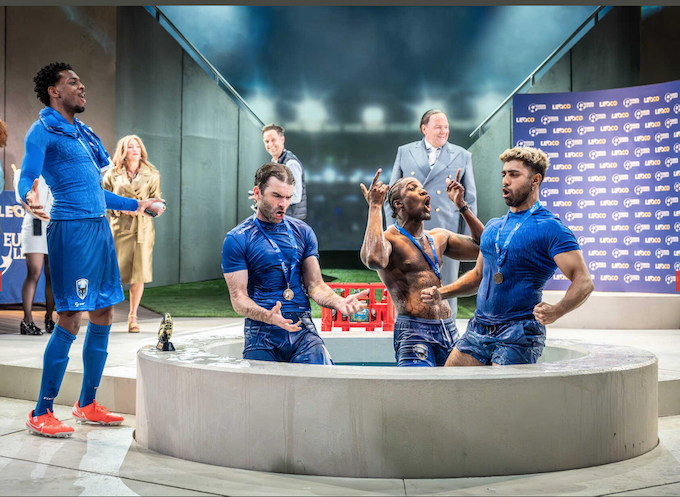 Oliver Huband is an excellent Don Pedro. As the manager, he has an intimate relationship with the team. He is addressed as Sweet Prince, but then Jose Mourinho liked to be called The Special One. Note the physicality of the football field, the hugging the kissing, the jumping on top of each other. The photo above says it all. That’s what they do. He comes across as a commanding figure too.