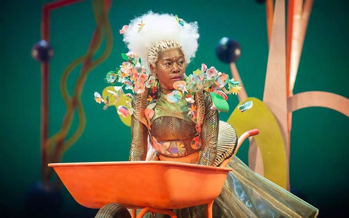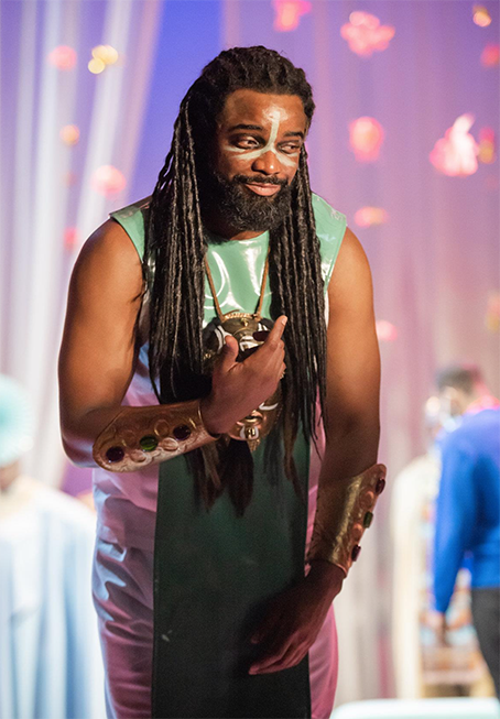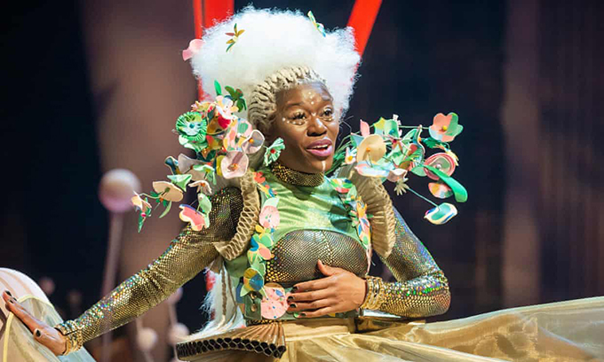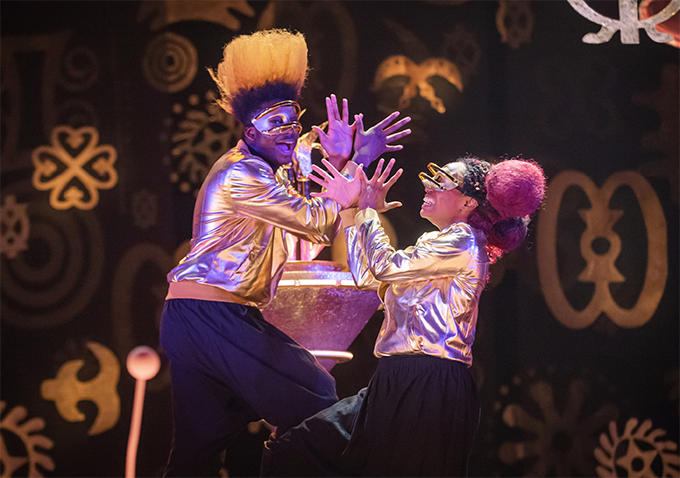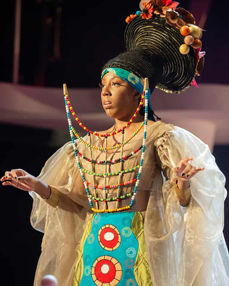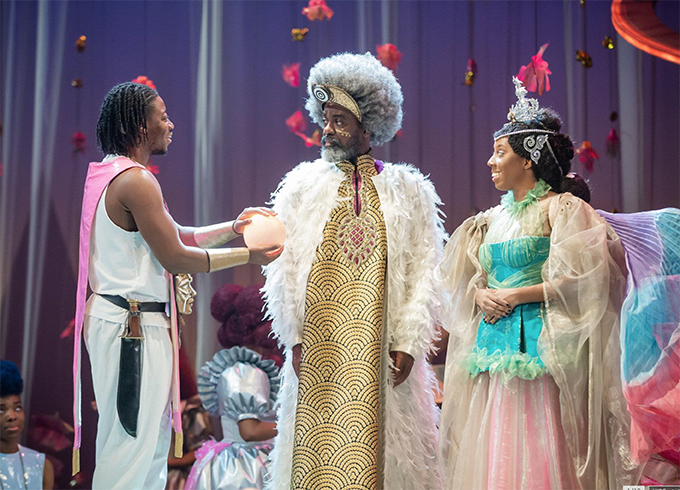 Every review starts out on the design and costume and lighting which are all breathtaking. Costume designer Melissa Simon-Hartman has dressed Beyoncé. Jemima Robinson’s set is a co-star, as is the intricate lighting plot. It looks extraordinary, the RSC programme knows that and devotes most of the text to the costume and set. The style is Afrofuturist (no, I’d never heard of it either), which references the Black Panther Marvel film, and (to me) Futurama with a touch of Star Trek Klingon-chic and Star Wars (the second batch). Add the stage clothes of Sun Ra & His Arkestra, and Funkadelic.