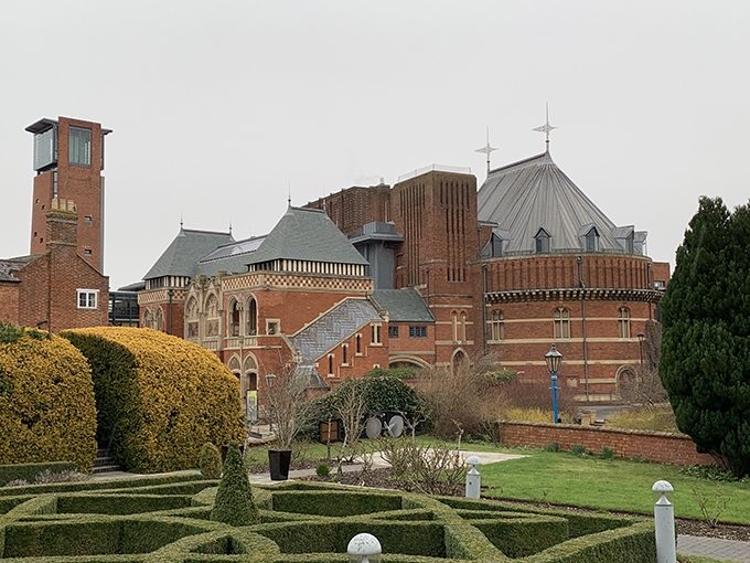 It was an effort to get here. It was a Red Weather Warning … “do not travel” in the morning. The news said the storm would be breaking up at 12.30 ish, which is when we decided to brave it and go. It took an hour longer from Poole to Stratford than normal … driving more slowly, a tree blocking the exit to the A34 and the Midands, a ten mile hold up on the M40 which we had to avoid by taking the more pleasant and shorter “old road” through Woodstock. We stopped for the loos just after Winchester and Karen nearly got blown over by the force of the storm winds. But we got there and it was worth it. We visited the RSC Garden Theatre last year, but this was the first time in two years we had been back inside the Royal Shakespeare Theatre. Vaccination checks on the way in, universal masking. Excellent precautions. The Rooftop Restaurant was as good as ever before the show. We were so glad to be back at the RSC.