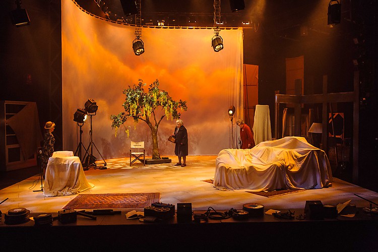 So to Salisbury, on the second day of its full month’s run. The stage is curtained right out to the platform with film spools decorating the edge. The play-in music is hits of 1961 … Connie Francis, Brian Hyland, after the interval Wanda Jackson. When the curtains open we see a film set with lights, and props are covered in dust sheets. There’s a tamarind tree (bare stage … a tree … where have I seen that, I thought). During the play the two stagehands gradually assemble Rutherford’s home, Nine Elms.