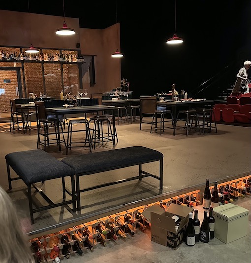 Otherwise the design looks great. The thrust stage has two rows of bottles right around underneath, which presumably emptied the Minerva restaurant’s back store. I mentioned that wine stores are not assorted in restaurants. Reds are together, and there are blocks of the same bottle not a variegated assortment of coloured tops and red, white and rosé, but OK, it looks better the way they did it.